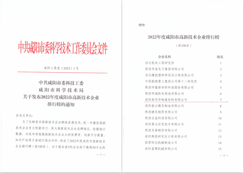 熱烈祝賀我公司榮獲咸陽2022年度高新技術企業排名第七名和科技型中小企業排名第十名
